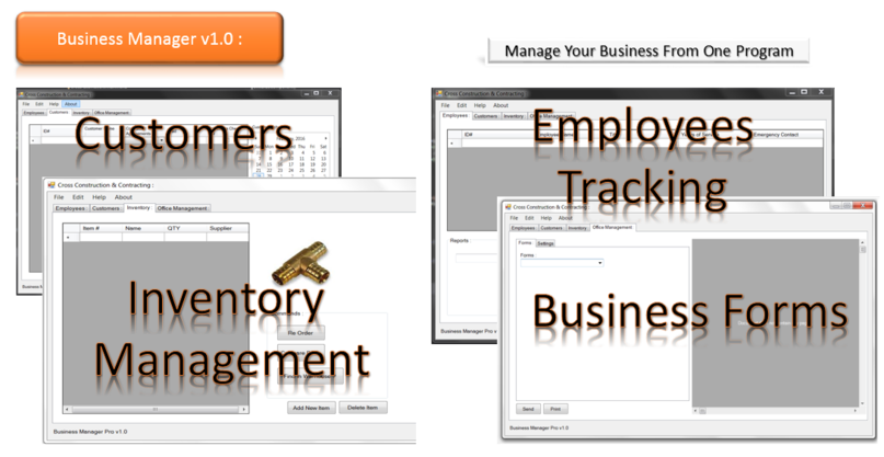 Are you a small business owner who struggles to stay organized? Does your desktop look like a mess of documents, Do you have no experience managing a company. Cross Automation & Consulting has a solution for you. Business Manager Pro v 1.0. Our low cost, light weight IDE can put your business on a firm foundation, providing you one tool to manage multiple aspects of your business.